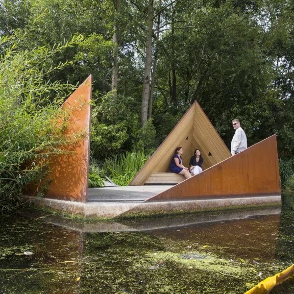 ヘザウィックは、閉店時にはシンプルな幾何学的オブジェのように見え、営業時には開くことで機能的な店舗へと変化する 折りたたみ式のキオスク をデザイン。 - 景観と一体化する都市家具